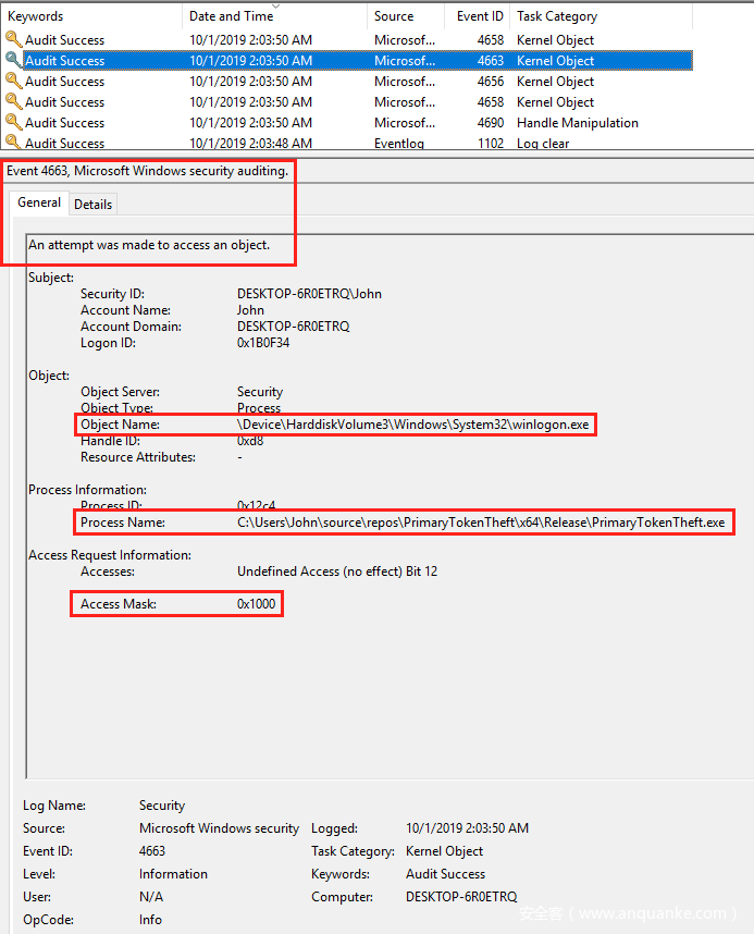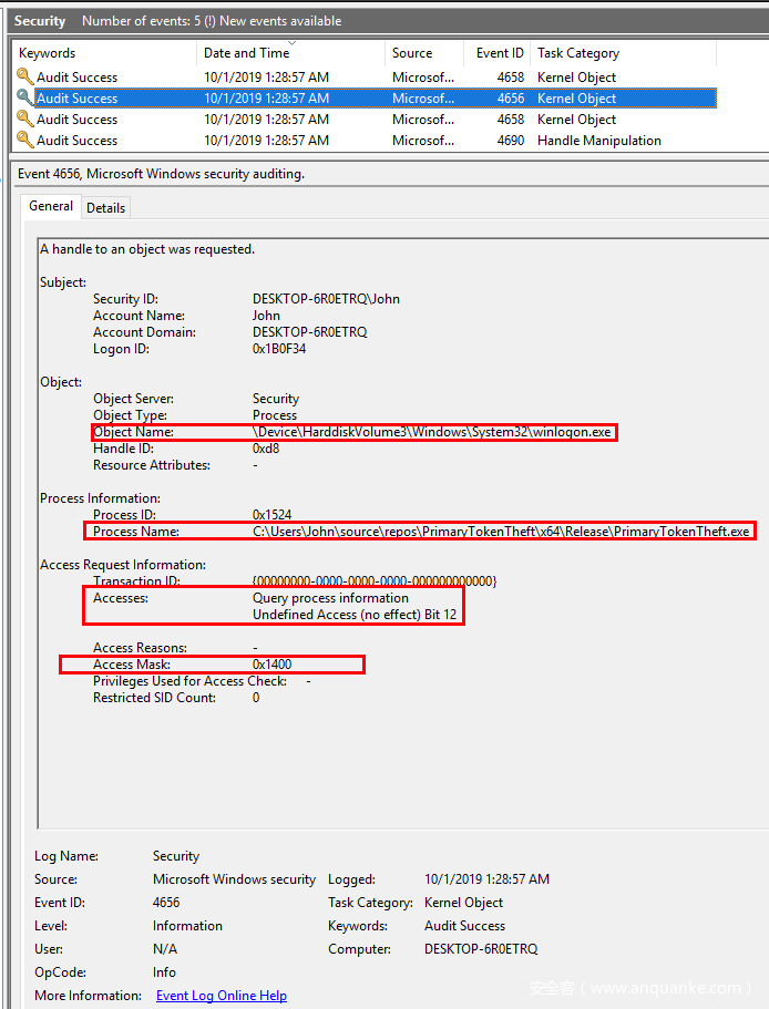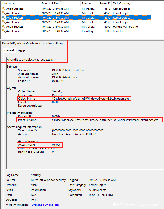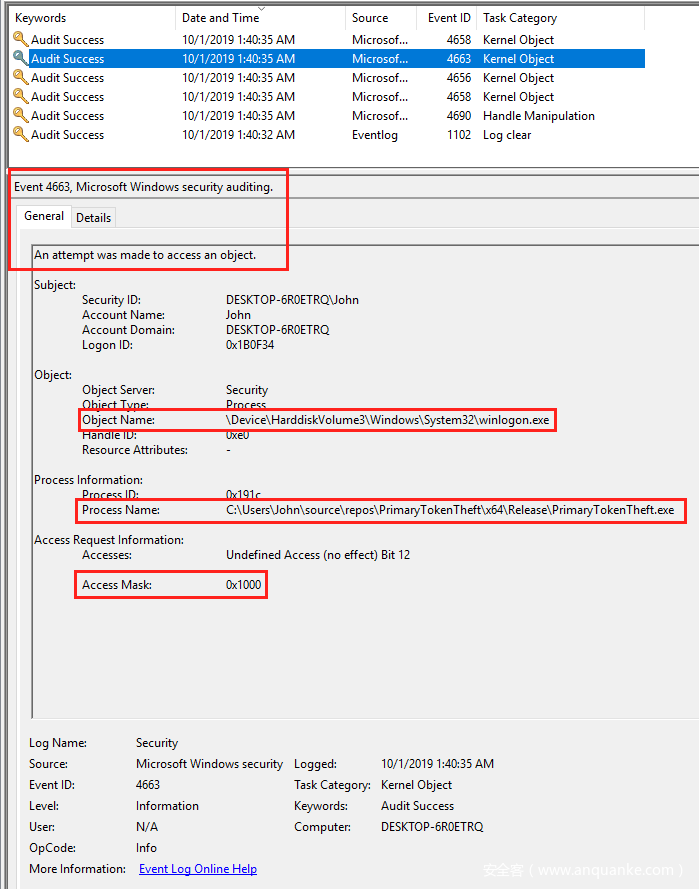此外,我们还可以看到EID 4663,表示我们的测试程序在请求句柄后,会尝试访问进程对象。因此,我们能通过搜索EID 4656以及EID 4663,以较高的准确率检测利用访问令牌的操作。