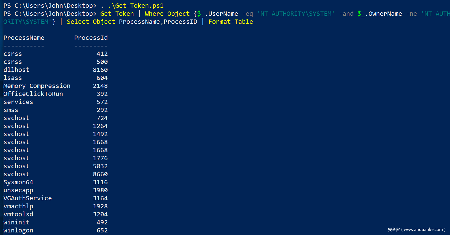 Get-Token | Where-Object {$_.UserName -eq ‘NT AUTHORITYSYSTEM’ -and $_.OwnerName -ne ‘NT AUTHORITY\SYSTEM’} | Select-Object ProcessName,ProcessID | Format-Table