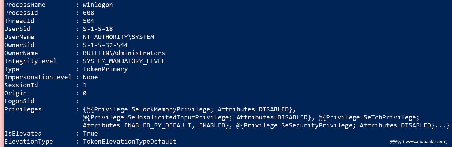 图. 利用Get-Token.ps1解析出来的winlogon.exe所对应的令牌对象