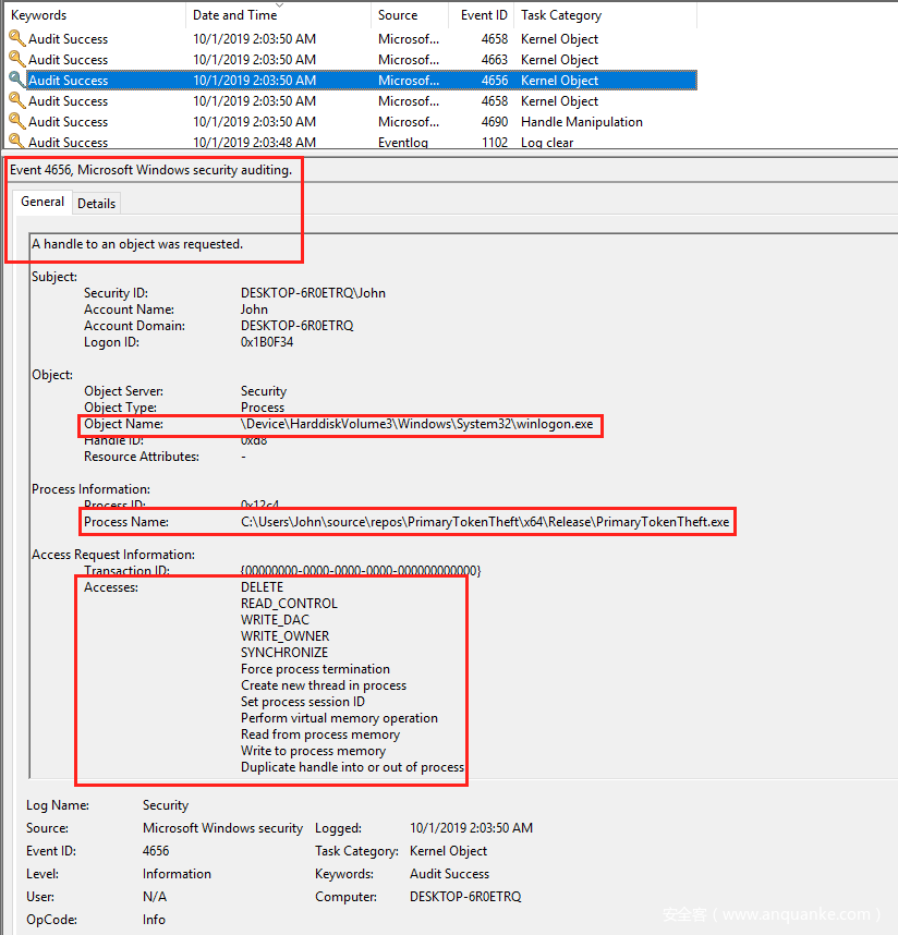 重新编译测试程序,使用PROCESS_ALL_ACCESS访问权限后,我们能看到与场景2相同的EID,其中在EID 4656中,可以看到有程序在请求其他访问权限。