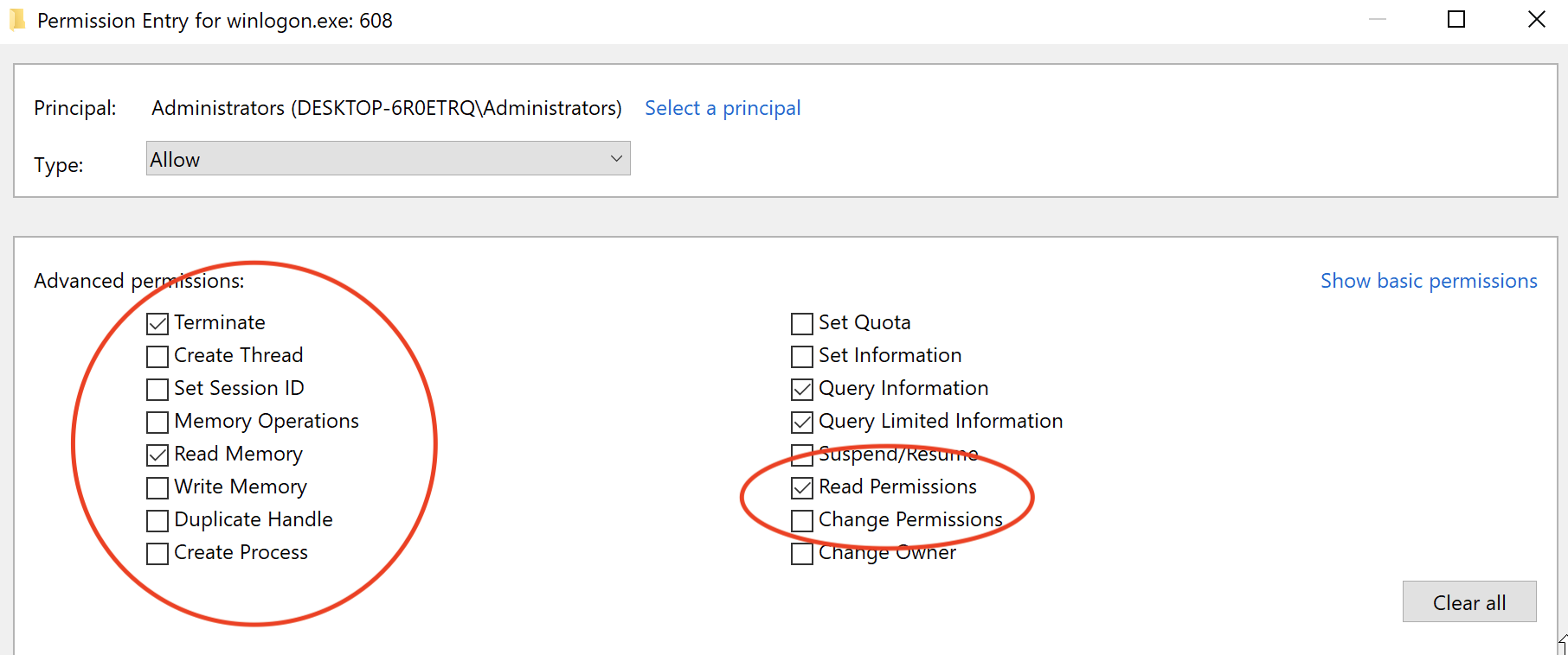 我决定深入分析winlogon.exe以及spoolsv.exe在高级安全设置(Advanced Security Settings)上的区别。我注意到这两者在管理员组的高级权限上有所不同。对于winlogon.exe,管理员组具备“Terminate”、“Read Memory”以及“Read Permissions”权限,而spoolsv.exe上的管理员组并不具备这些权限。