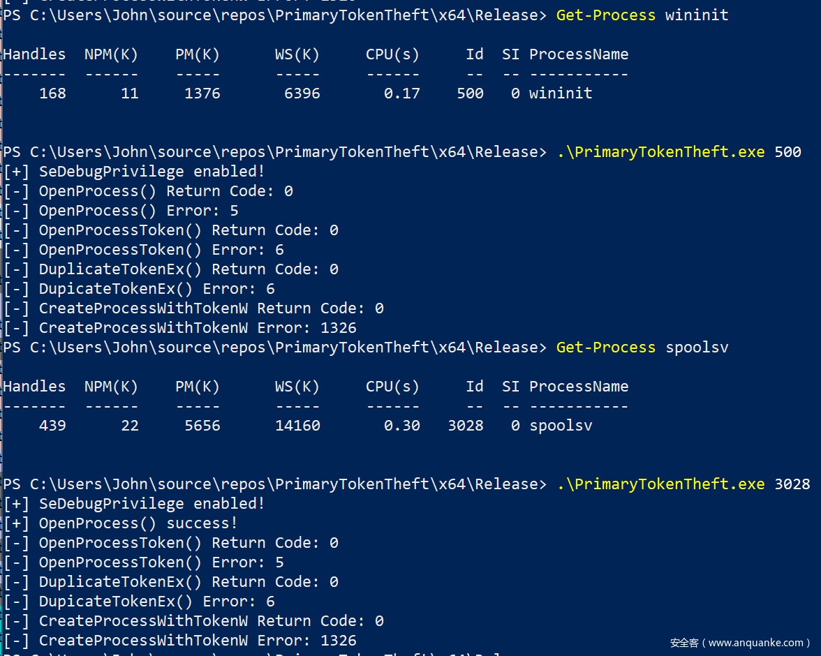 对于某些SYSTEM进程,OpenProcess()会执行成功,但执行OpenProcessToken()时会出现拒绝访问错误。后面我将研究一下为什么会出现这种问题。