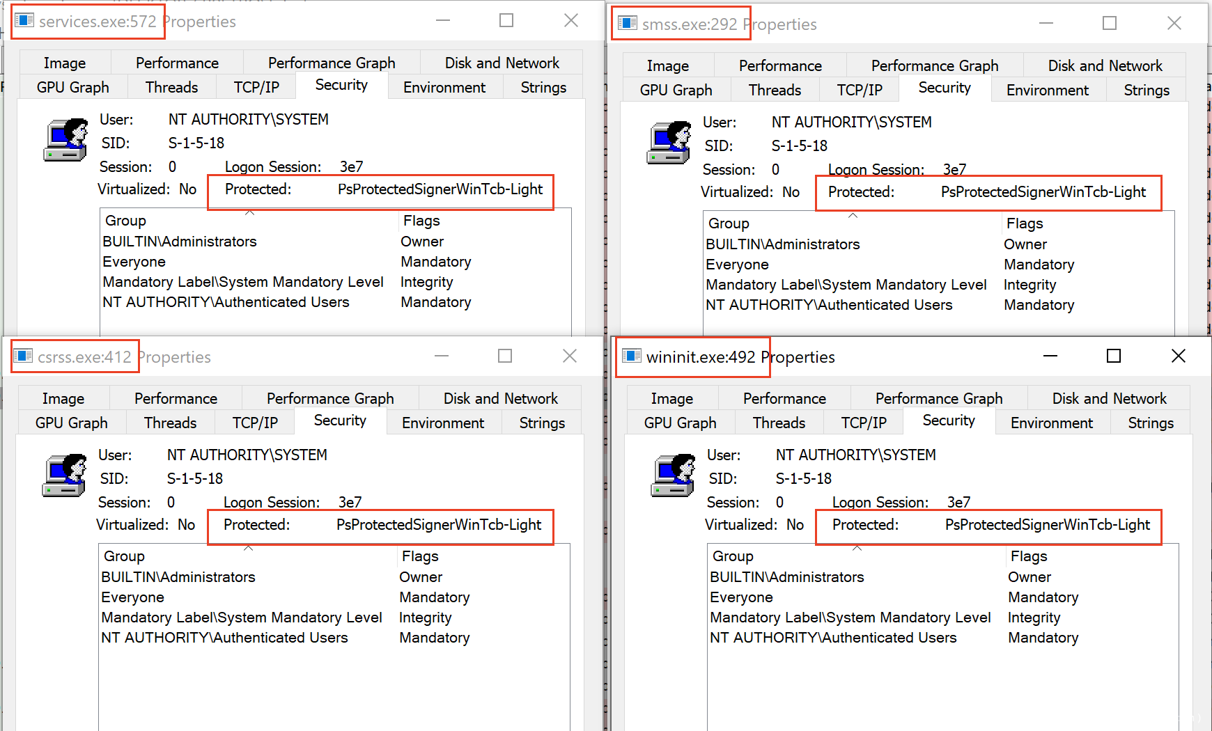 前面提到过,某些SYSTEM进程在我调用OpenProcess()时,会返回拒绝访问错误,无法窃取令牌。我使用Process Explorer观察这些进程,发现了可能解释该行为的一个共同属性:PsProtectedSignerWinTcb-Light。