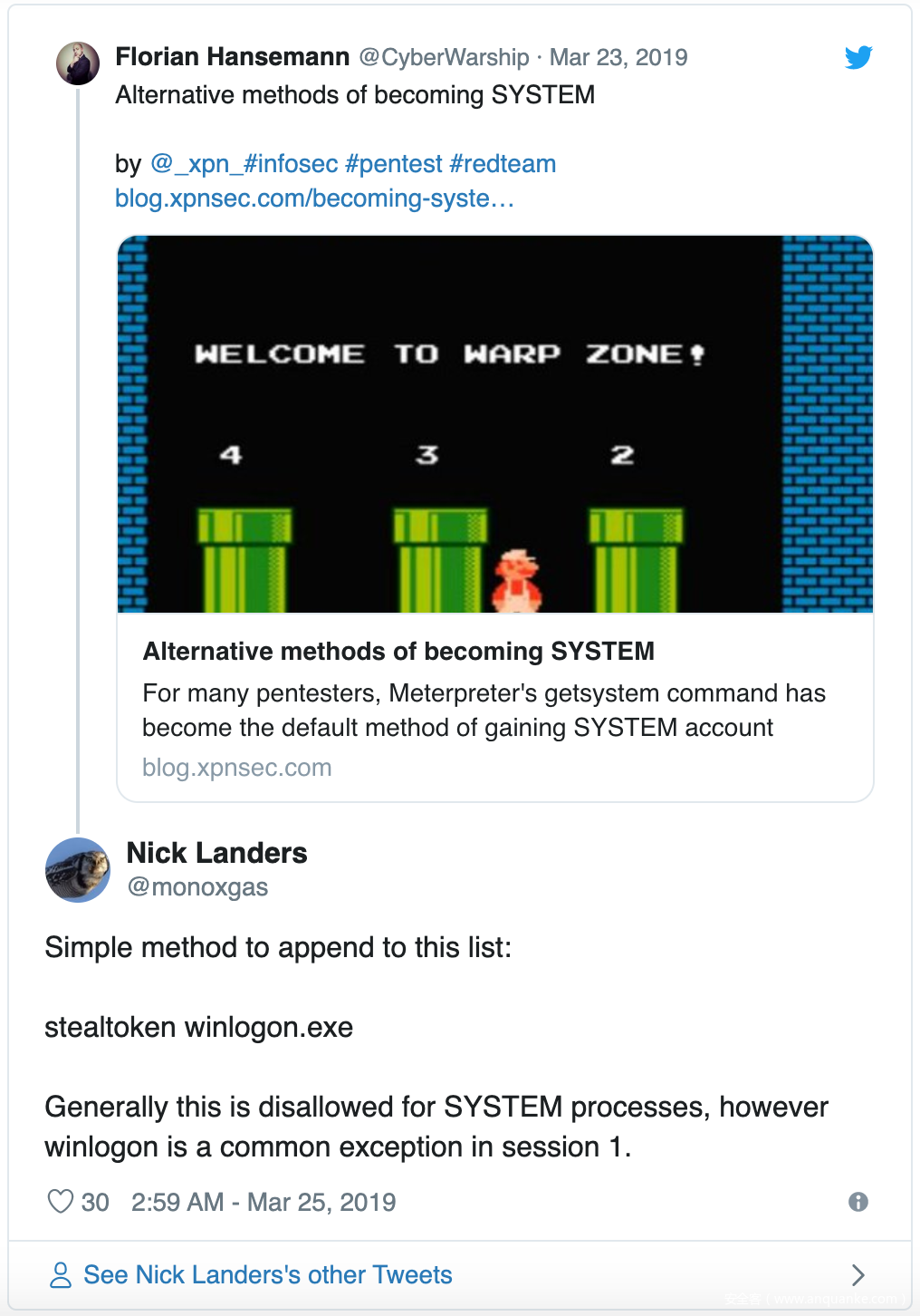 在今年早些时候,Nick Landers介绍了从本地管理员提升到NT AUTHORITY\SYSTEM的一种简单方法。