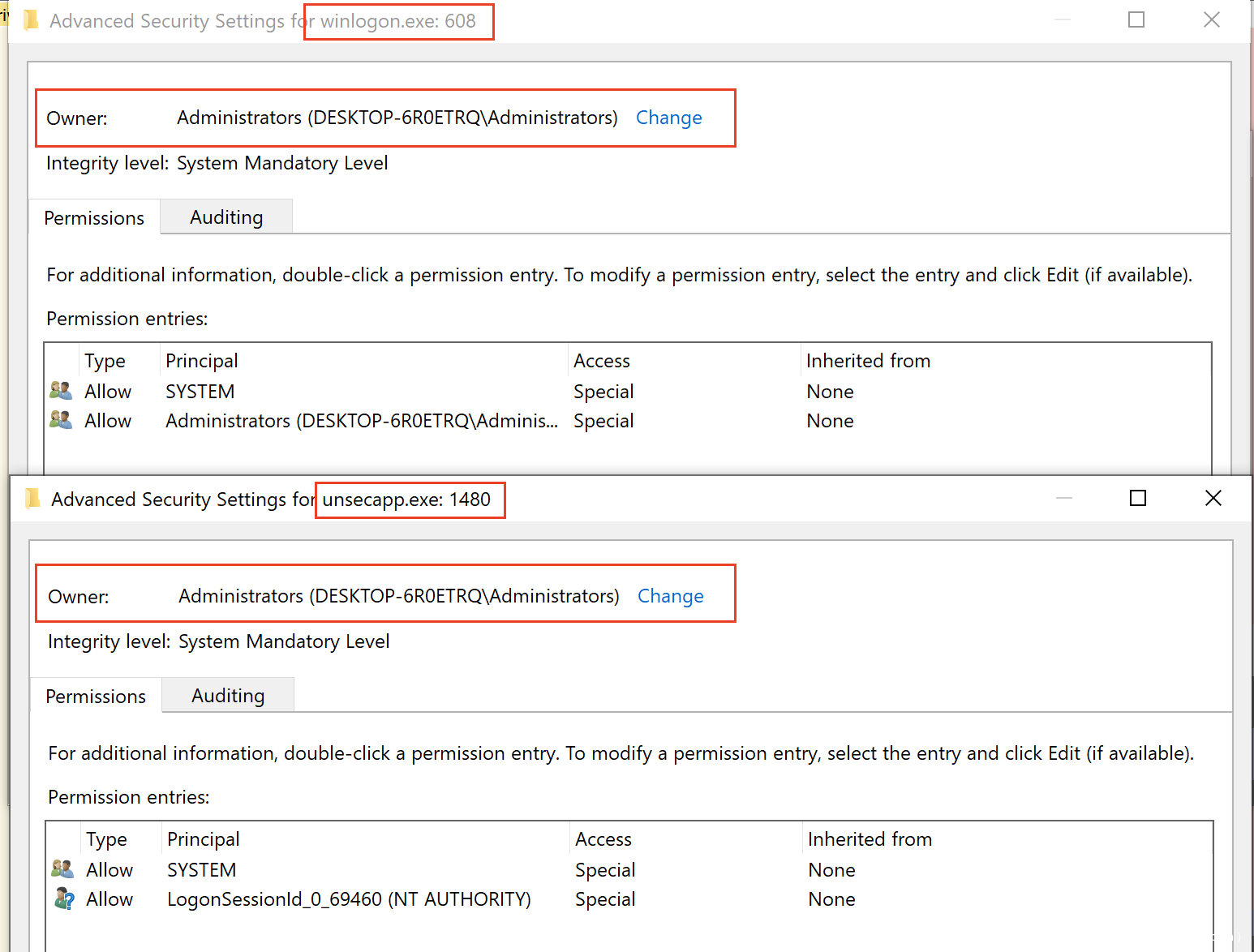 OpenProcessToken(),那么BUILTIN\Administrator必须为TokenOwner; - 如果