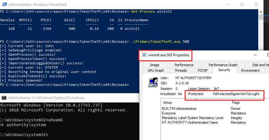 在测试检测机制时,我了解到OpenProcessToken()所需的最小访问权限为PROCESS_QUERY_LIMITED_INFORMATION,这与微软提供的官方描述有所不同。我修改了调用OpenProcess()期间所需的访问权限,最终成功拿到了SYSTEM级别的命令提示符。