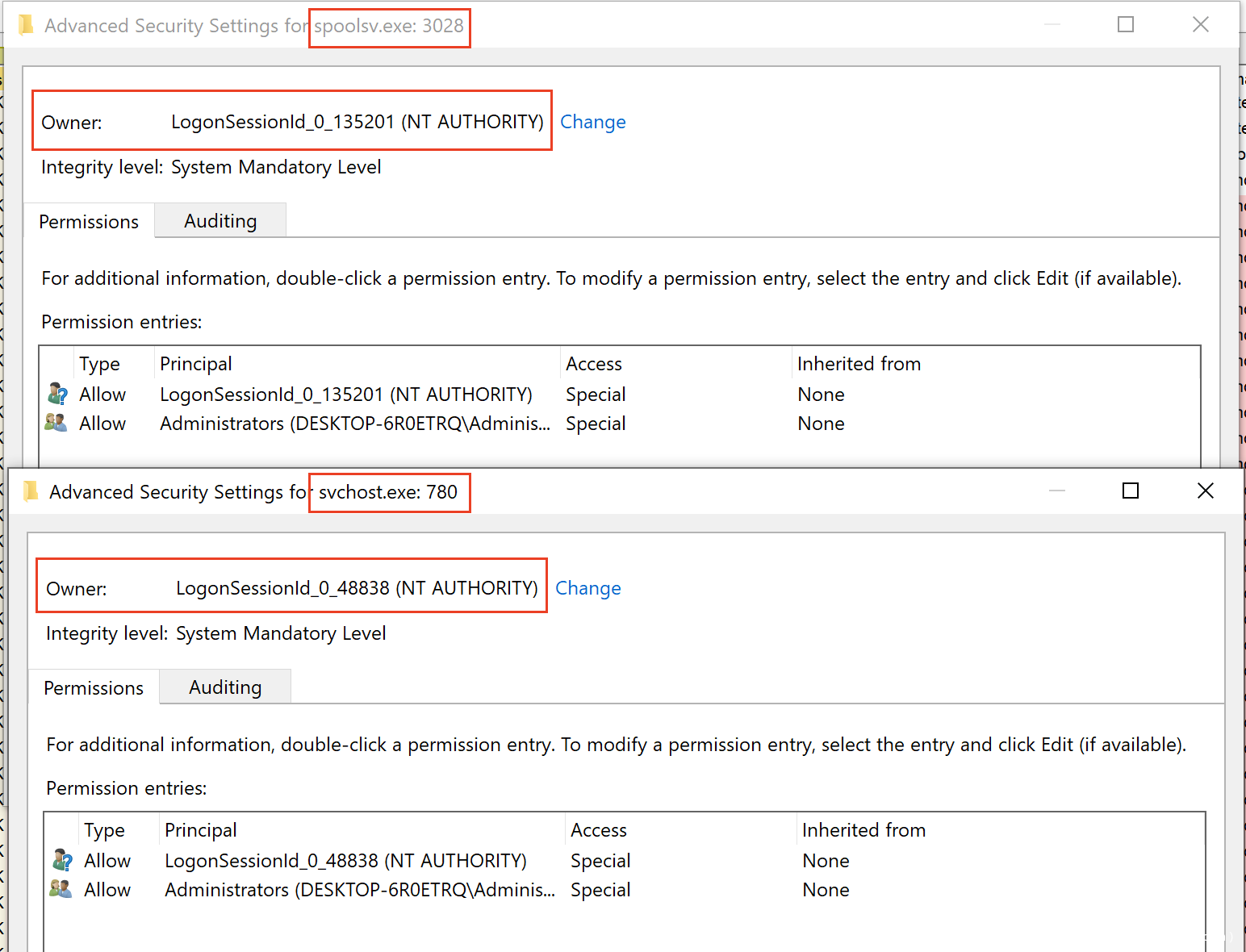 我的目标是找到允许令牌操作的SYSTEM进程在安全设置上存在哪些不同,我决定比较一下winlogon.exe以及spoolsv.exe。这两个进程都是SYSTEM进程,但我只能从winlogon.exe中窃取SYSTEM访问令牌。