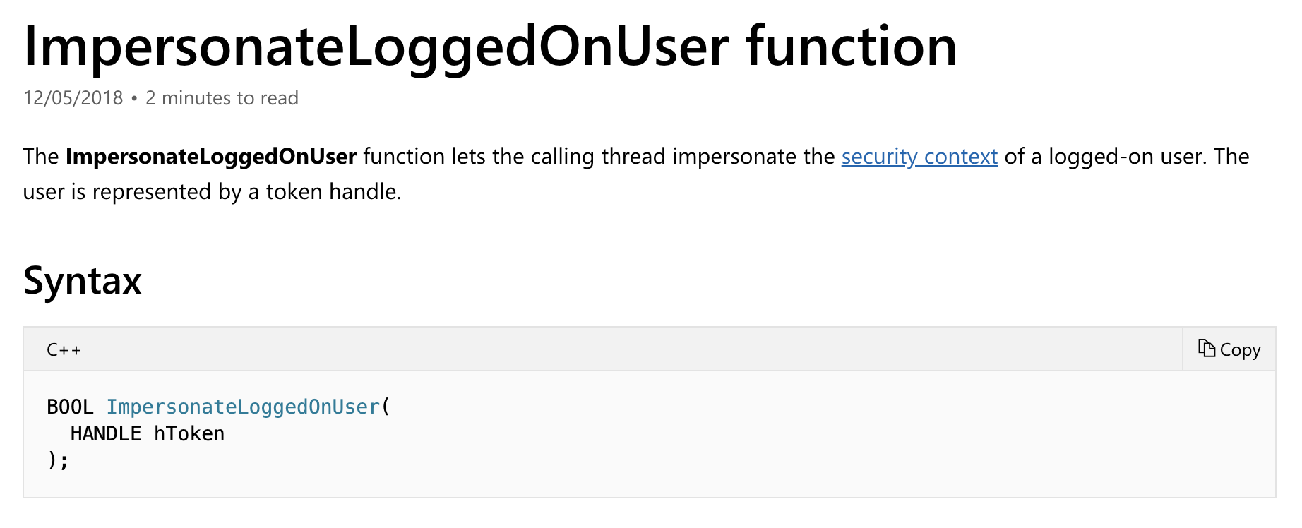 利用OpenProcessToken()获取令牌句柄后,我们可以使用ImpersonatedLoggedOnUser(),使当前进程可以模拟已登录的另一个用户。该进程会继续模拟已登录的该用户,直到线程退出或者我们显示调用RevertToSelf()。