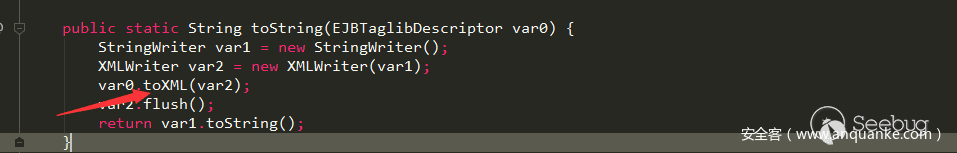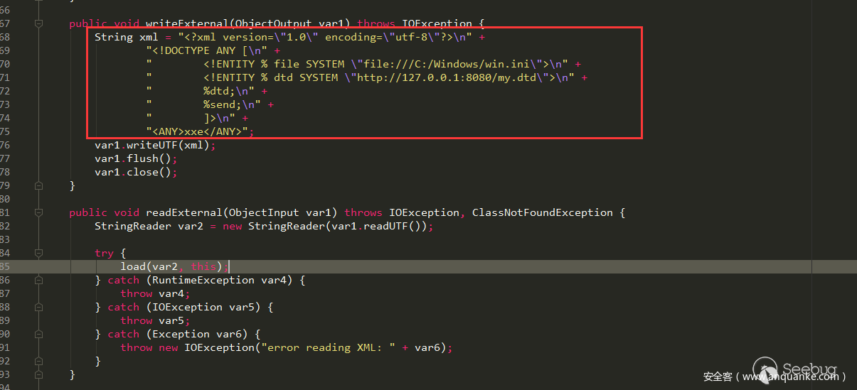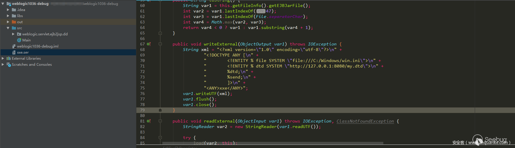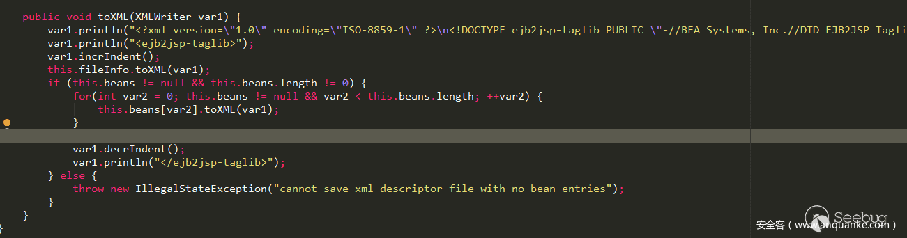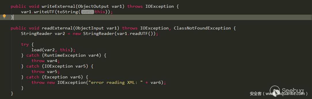 toXML的作用应该是将this.beans转换为对应的xml数据。看起来要构造payload稍微有点麻烦,但是序列化操作是攻击者可控制的,所以我们可以直接修改writeExternal的逻辑来生成恶意的序列化数据: