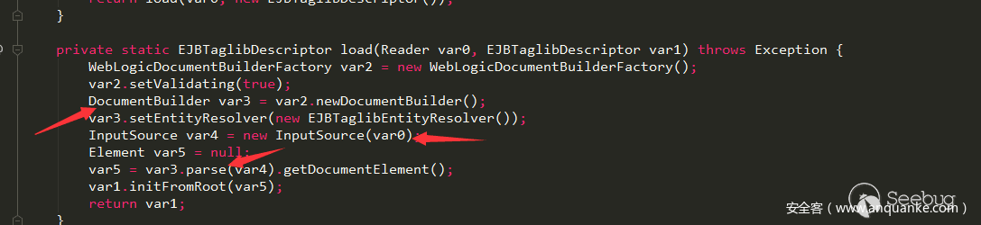 这个漏洞和之前@Matthias Kaiser提交的几个XXE漏洞是类似的,而EJBTaglibDescriptor应该是漏掉的一个,可以参考之前几个XXE的分析。我和@Badcode师傅反编译了WebLogic所有的Jar包,根据之前几个XXE漏洞的特征进行了搜索匹配到了这个EJBTaglibDescriptor类,这个类在反序列化时也会进行XML解析。