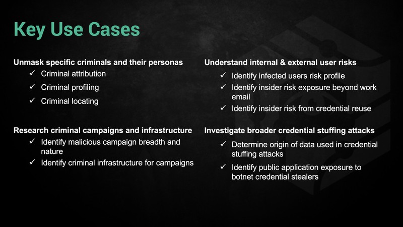在另一个ppt中,SpyCloud表示,这些数据可以用来“揭露特定的罪犯及其角色”,包括“罪犯定位”。