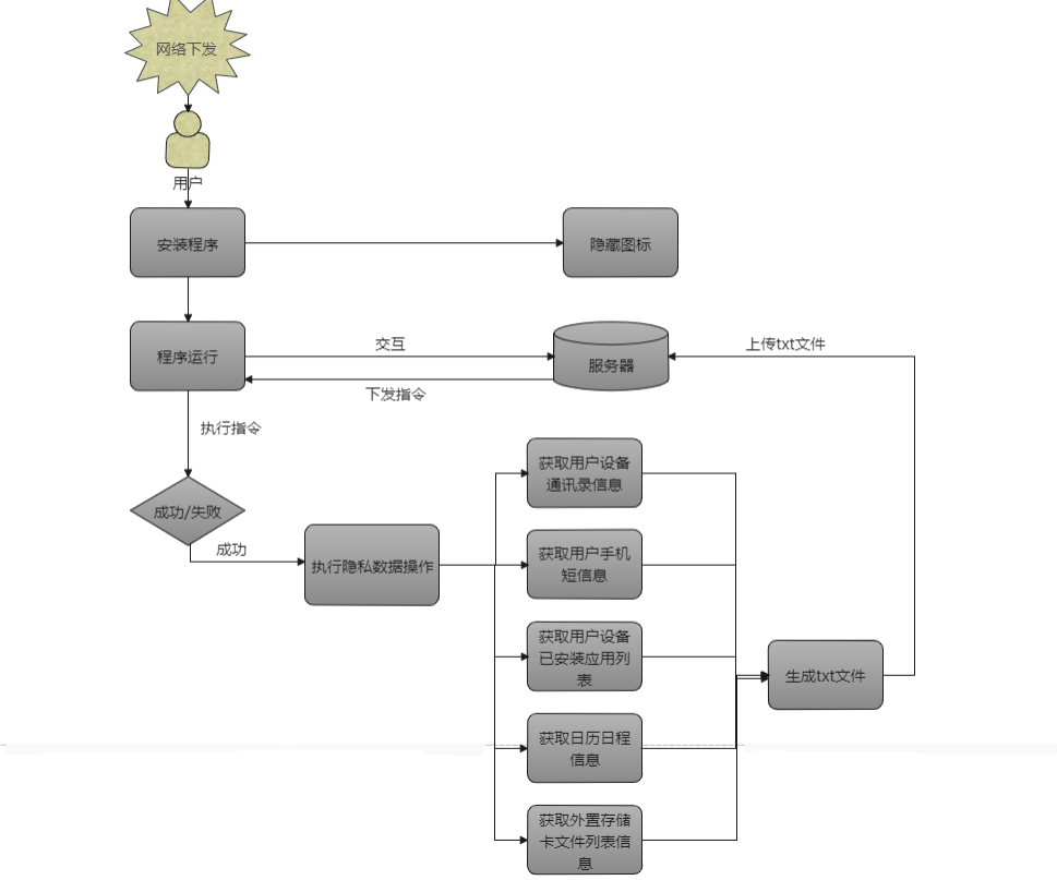程序运行,隐藏图标,后台运行与服务器进行交互,执行不同的远程指令,根据指令获取用户隐私信息,将包含短信、联系人、通讯录、日历行程等信息的txt文件上传到服务器。