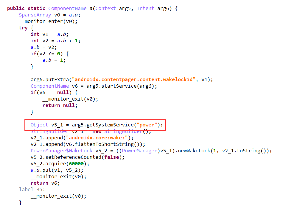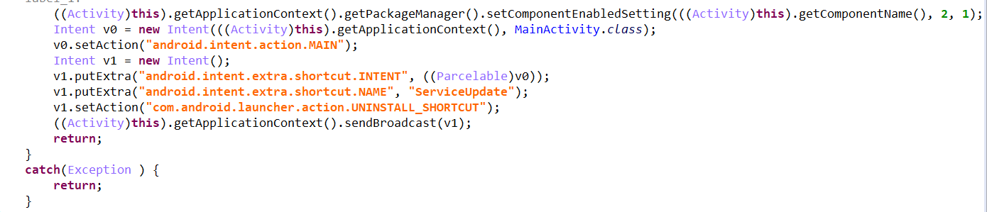 恶意程序在除仿冒微信之外在其他方式了进行了自我防护,首先隐藏安装图标,对普通用户而言就达到了隐藏目的。隐藏图标后为了保障其能够长时间的运行,在技术上使用了电源锁,来保障恶意程序长时间运行。在通讯方式上采用了AES加密传输,来保障通讯信道传输安全。