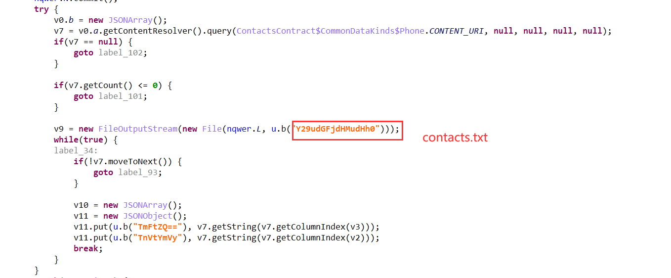 2)当服务器下发远程指令Q1RmbGFn,根据远程指令Q1RmbGFn将通讯录信息保存在contact.txt文件当中,并获取用户通讯录信息。
