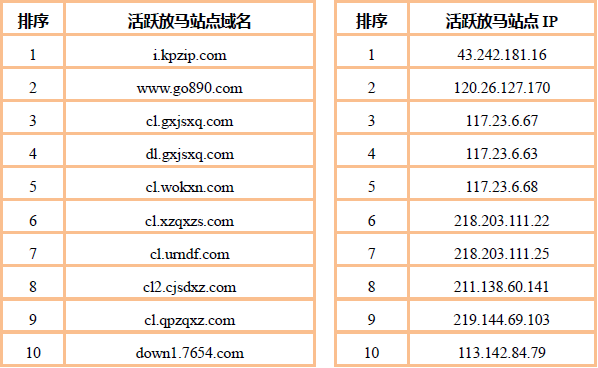 网络病毒主要针对一些防护比较薄弱,特别是访问量较大的网站通过网页挂马的方式进行传播。当存在安全漏洞的用户主机访问了这些被黑客挂马的网站后,会经过多级跳转暗中连接黑客最终“放马” 的站点下载网络病毒。2017 年 10 月,CNCERT 监测发现排名前十的活跃放马站点域名和活跃放马站点 IP 如表 1 所示。
