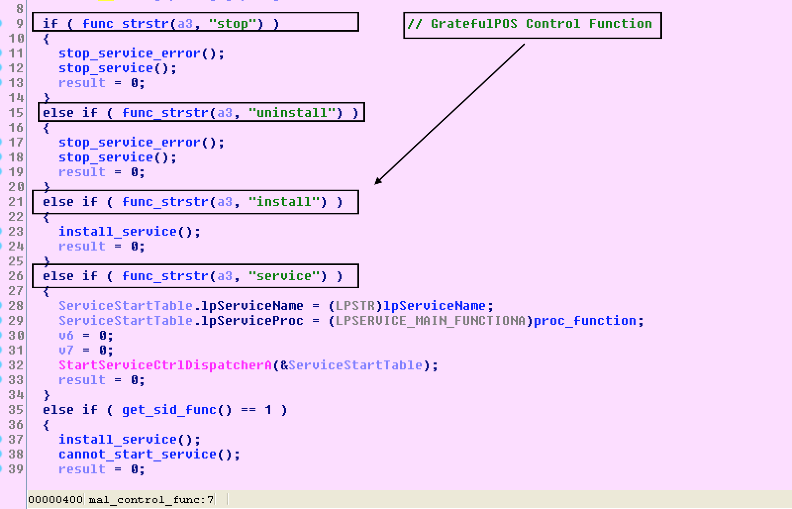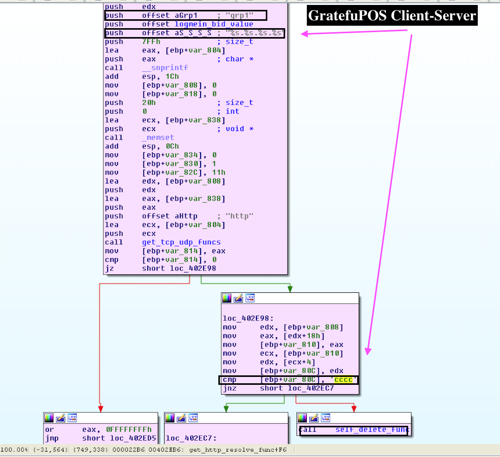 最终,恶意软件将此信息作为ping.%s.%s.%s.%s的一部分,并将其作为第一个参数存储,以连接服务器ns[.]a193-45-3-47-deploy-akamaitechnologies[.]com (GET /index.php HTTP/1.0,其中的bot id是通过GetComputerNameA进行XOR,使用“0AAh”作为字节密钥,并转换成十六进制)。总之,恶意软件会在一个单独的线程中运行,并调用Server。POS恶意软件在下一次调用Server时,会随机休眠2-3小时(rand() % 3600000 + 7200000)。在将数据发送到服务器时,GratefulPOS还会将可能的活动标识符作为“grp1”添加到请求中。值得注意的是,如果恶意软件读取到值为“cccc”,它会从系统中将自己移除。该恶意软件同时还会收集本地计算机名和本地IP地址。