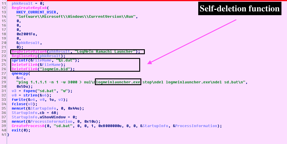 恶意软件在读取到“cccc”指令后,会将其自身删除,并且删除相应的注册表项“LogMeIn Hamachi Launcher”。