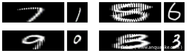 基于这个攻击思路,我们也对其它深度学习应用进行了测试。 例如著名的深度学习教科书案例 MINST 手写数字识别,我们可以成功生成对人很清楚的数字,但会被深度学习系统误识别的图片。下面显示了四组图片。 每一组中,左边是对应用的输入,也就是人看到的图片;右边是人看不到,但是被机器学习模型最后处理的图片。 这样的图片变化,造成深度学习系统出现错误识别应该不难理解。