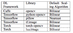 降维攻击会影响到使用维度调整的深度学习系统。 著名的深度学习平台,包括TensorFlow,Caffe,Torch都提供维度调整函数供深度学习应用程序使用。 下面的表格里展示了常用深度学习框架中使用的维度调整算法。使用这些算法的程序都可能受到降维攻击的影响。