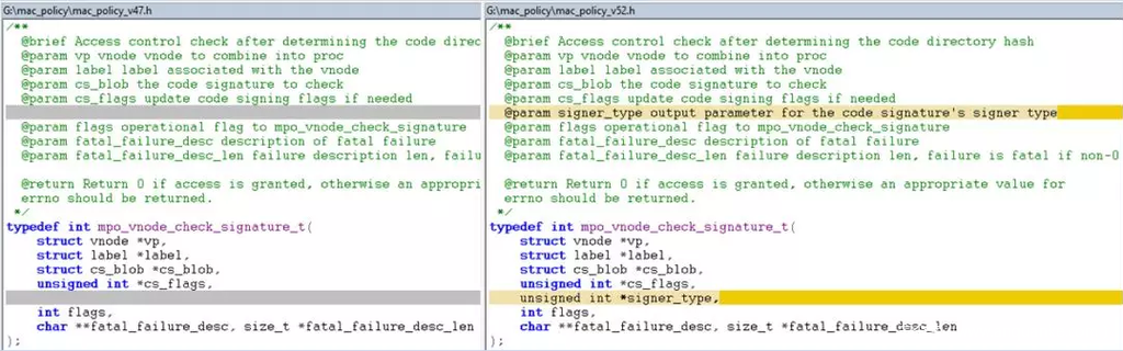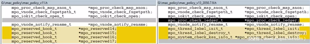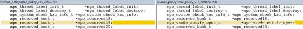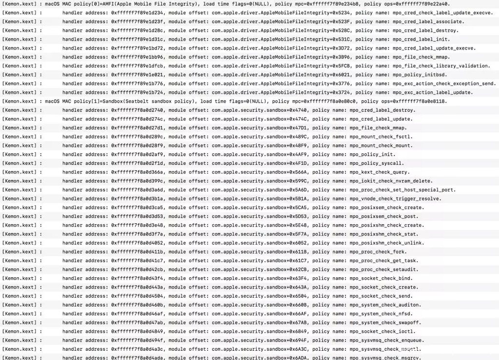 DEFCON 26展示的功能是强制访问控制策略监视器。值得一提的是,在现有系统里没有任何方法可以窥探前述的 Mandatory Access Control Policy 私有接口的使用情况,但是通过 Kemon 框架我们可以清楚地看到,苹果公司的 AMFI(Apple Mobile File Integrity)[9]、沙箱(Apple Seatbelt Sandbox)[10] 等模块都大量使用了上述接口: