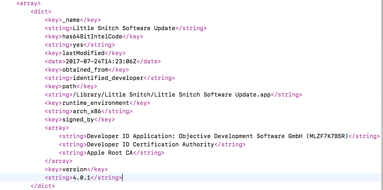 获取设备装机列表方式通过执行“/usr/sbin/system_profiler -xml SPApplicationsDataType“指令来完成: