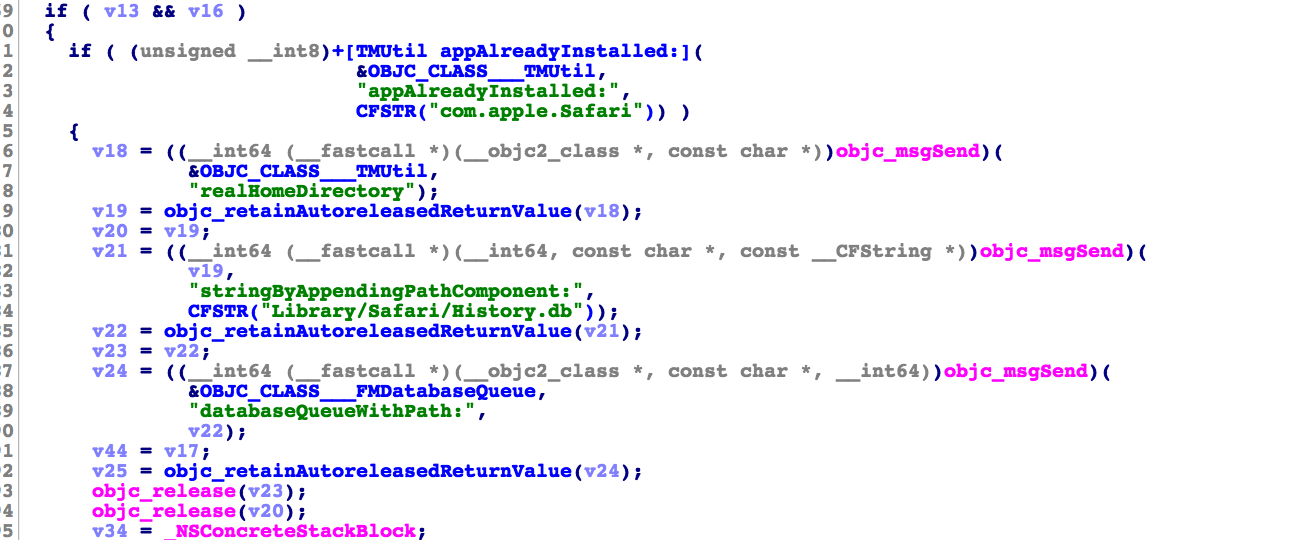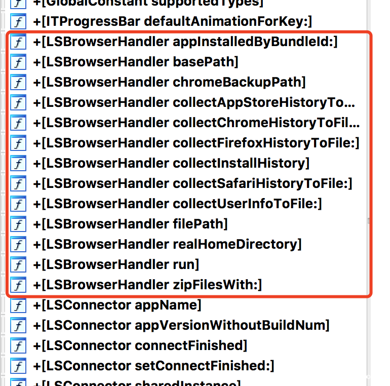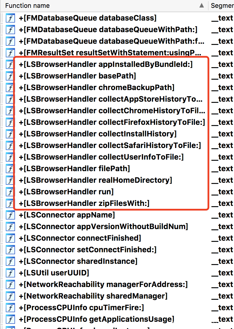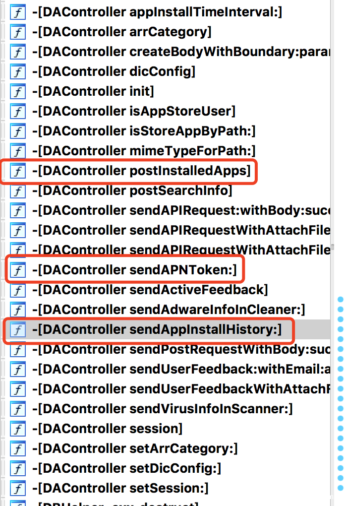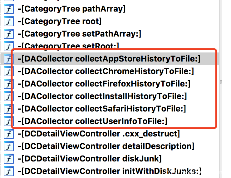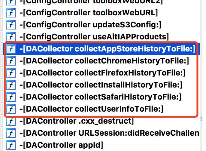 Dr.Unarchiver里读取隐私部分主要位于-[DACollector *]模块中,从模块命名可以发现,除了3个浏览器记录,同时还读取了AppStore历史记录、设备装机列表、用户信息等。