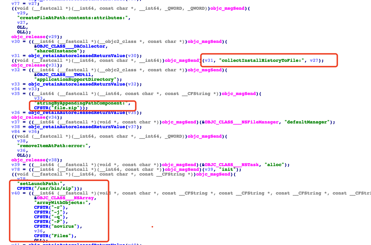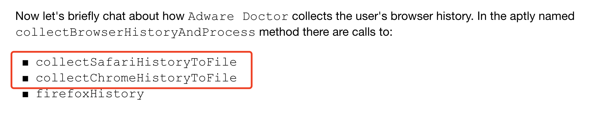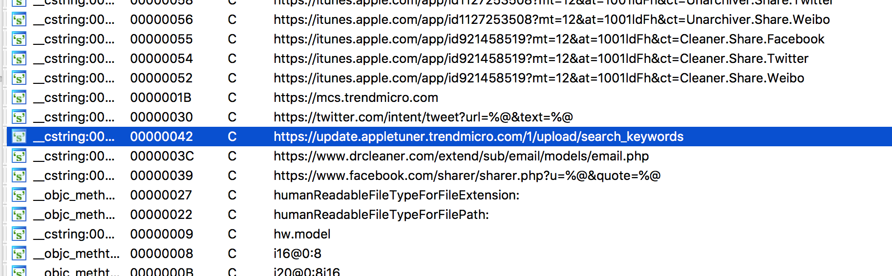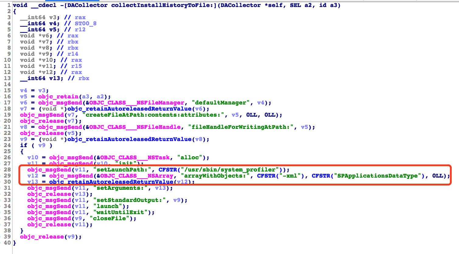 Dr.Unarchiver里读取隐私部分主要位于-[DACollector *]模块中,从模块命名可以发现,除了3个浏览器记录,同时还读取了AppStore历史记录、设备装机列表、用户信息等。