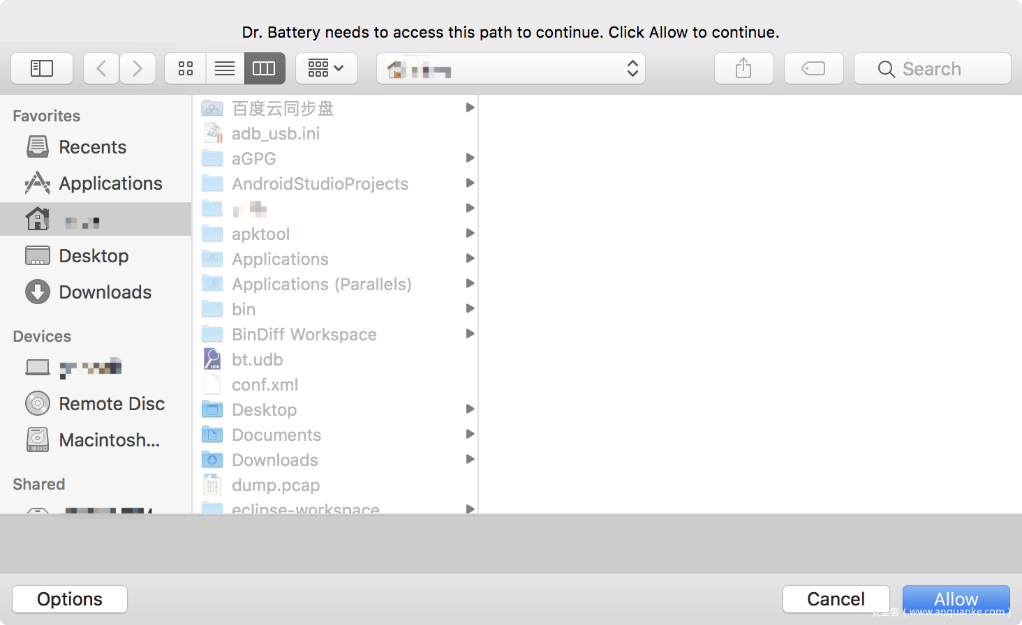 DrBattery初次运行会要求访问用户主目录(其他程序初次运行也都会申请相关访问权限):