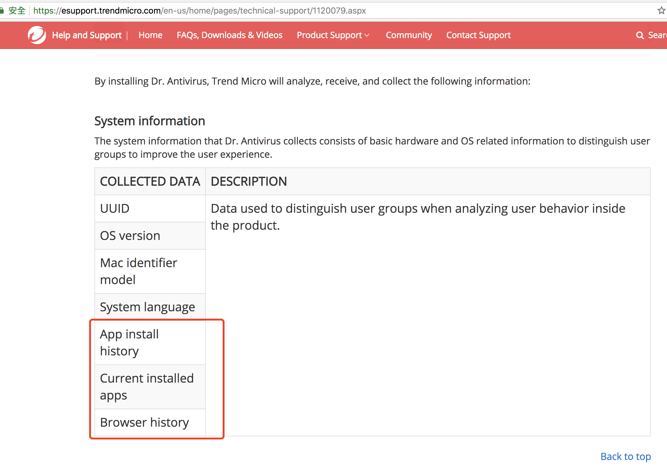 下图为趋势官网Dr. Antivirus产品说明,里面明确申明会读取app安装历史记录、当前装机列表、浏览器记录等隐私,作为反病毒软件读取app列表能理解,但回传浏览器记录、搜索记录等隐私就过了。