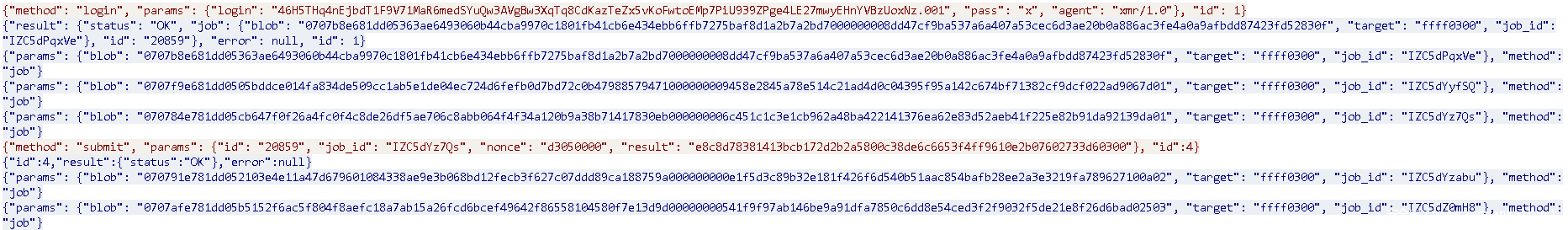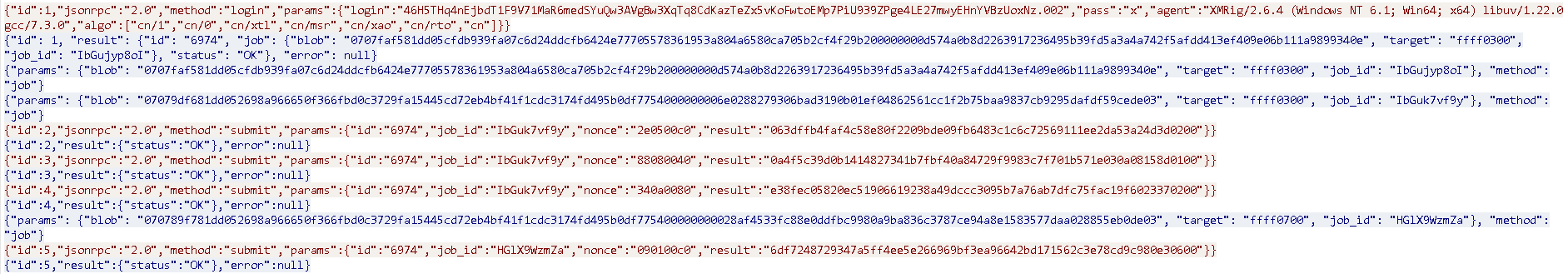 alert tcp-pkt $HOME_NET any -> $EXTERNAL_NET any (msg:"ET POLICY Cryptocurrency Miner Checkin"; flow:established,to_server; content:"|7b 22|id|22 3a|"; nocase; depth:6; content:"|22|jsonrpc|22 3a|"; nocase; distance:0; content:"|22 2c 22|method|22 3a 22|login|22 2c 22|params|22 3a|"; fast_pattern; content:"|22|pass|22 3a 22|"; nocase; content:"|22|agent|22 3a 22|"; nocase; content:!"<title"; nocase; content:!"<script"; nocase; content:!"<html"; nocase; metadata: former_category POLICY; classtype:policy-violation; sid:2024792; rev:4; metadata:affected_product Windows_XP_Vista_7_8_10_Server_32_64_Bit, attack_target Client_Endpoint, deployment Perimeter, signature_severity Minor, created_at 2017_10_02, updated_at 2018_06_15;)