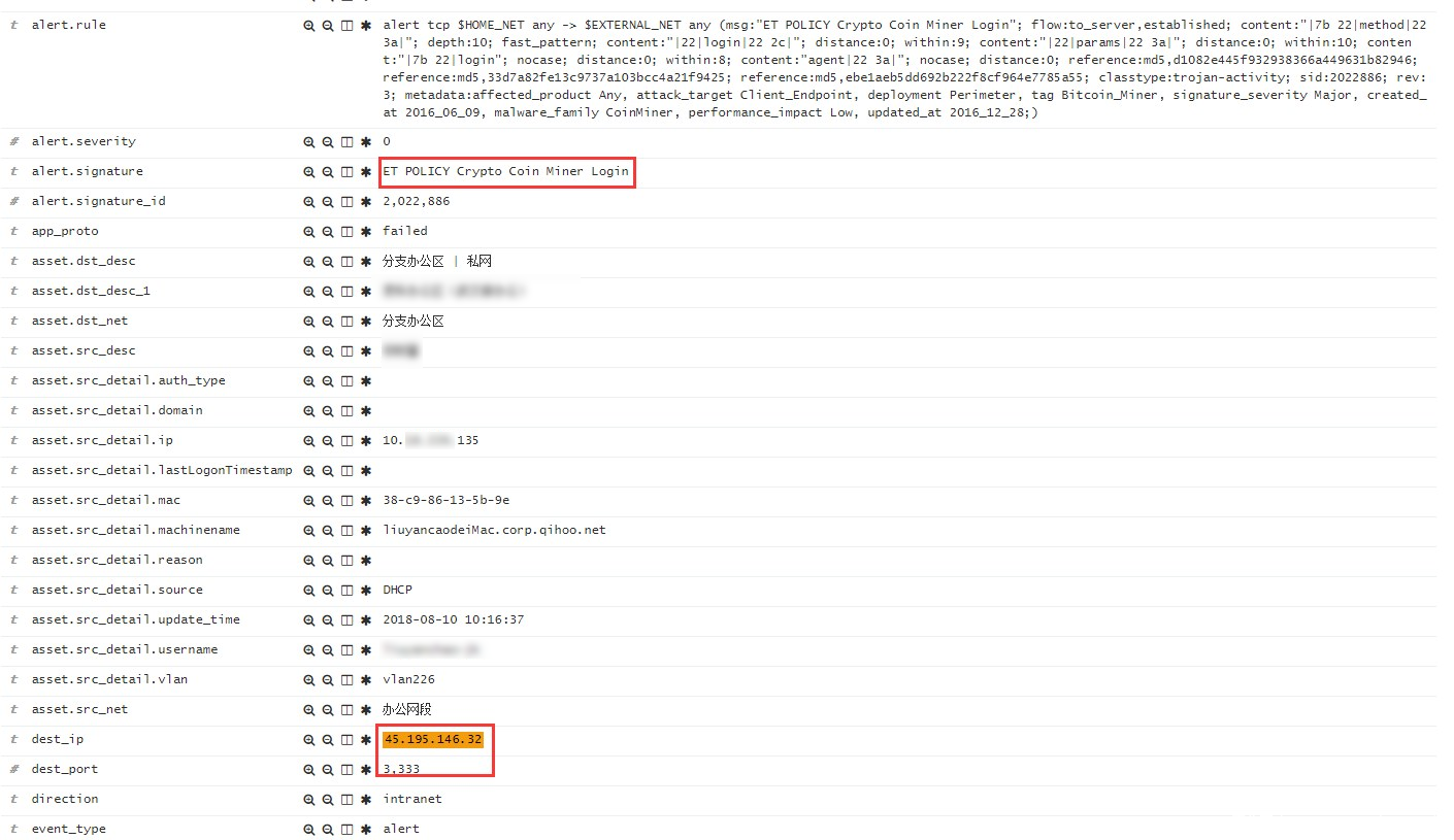 8月10日前后,内网发现大量挖矿告警,告警地址显示为45.195.146.32,该IP地址对应域名funningx.com,告警端口为3333,产生告警截图如下