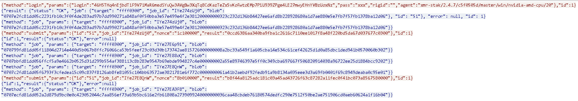 alert tcp $HOME_NET any -> $EXTERNAL_NET any (msg:"ET POLICY Crypto Coin Miner Login"; flow: to_server,established; content:"|7b 22|method|22 3a 20 22|login|22 2c 20 22|params|22 3a 20 7b 22|login"; nocase; depth:37; fast_pattern:17,20; content:"agent|22 3a 20 22|"; nocase; distance:0; reference:md5,d1082e445f932938366a449631b82946; reference:md5,33d7a82fe13c9737a103bcc4a21f9425; reference:md5,ebe1aeb5dd692b222f8cf964e7785a55; classtype:trojan-activity; sid:2022886; rev:2;)除开源规则外,还可使用如下规则,监控挖矿软件与矿池之间的网络通信过程。