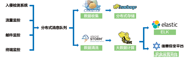 我们日常安全运营依赖自研的宙合大数据威胁检测平台,整合终端、流量、网络边界、邮件等安全防护设备产生的告警信息和安全日志,基于特征检测、威胁情报和大数据关联聚合等技术手段,构建了一套基于大数据技术的内网威胁检测体系。通过数据关联和聚合分析,为网络扫描、漏洞利用、病毒传输、风险行为、邮件钓鱼等多种威胁场景的日常运营分析工作提供数据平台支撑。系统基本架构如下所示: