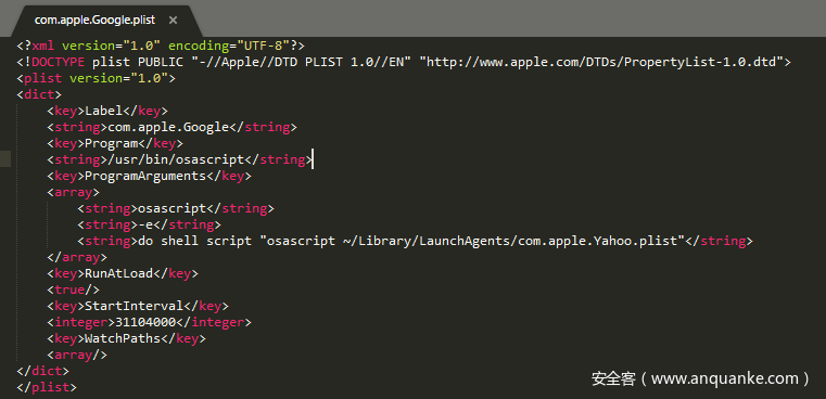 在~/Library/LaunchAgents目录下发现两个plist文件:com.apple.Yahoo.plist和com.apple.Google.plist。其中com.apple.Google.plist是一个plist文件,内容如下: