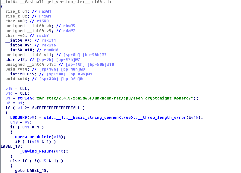 发现告警后,第一时间从网络资产管理系统中查询告警IP所属主机,确定主机为部分iMac和Macbook。拿到取证机后,接入网络,查看3333端口占用进程信息,定位到一个名为ssl.plist的进程。IDA静态分析样本行为,确认这是一个xmr-stak的矿机程序。