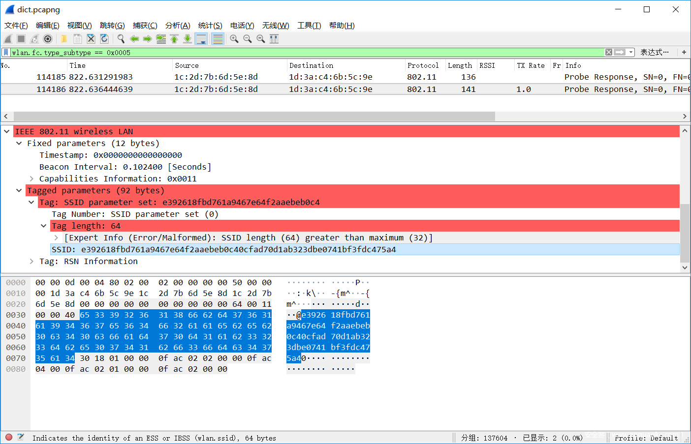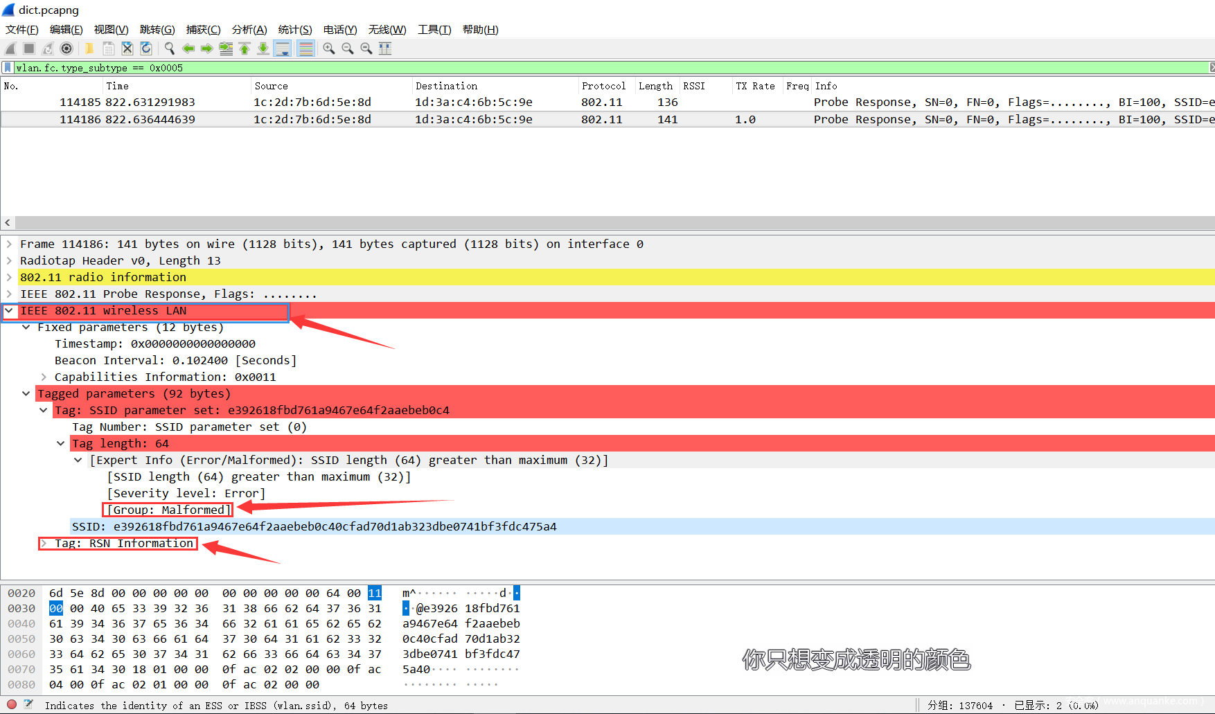 但是这两个畸形帧中SSID的长度为64,注意是64!,并且整个数据包里只有这两条Probe Response此类型 5447565467帧的数据分组,你说可不可疑=