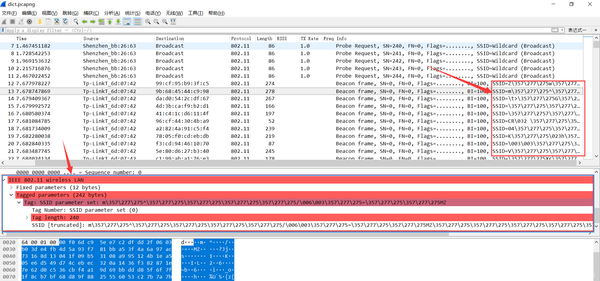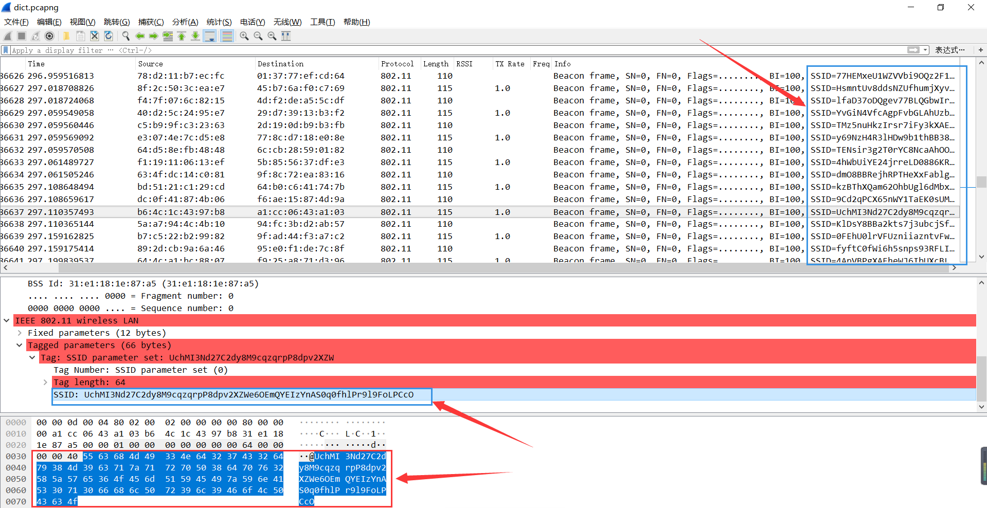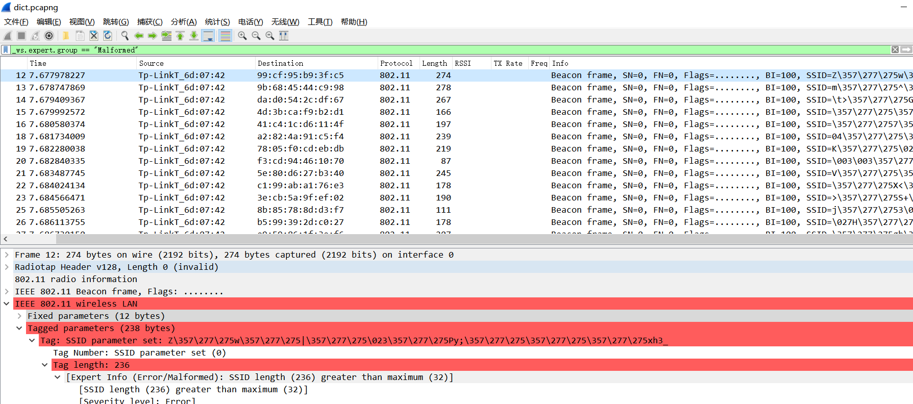打开数据包dict.pcapng,简单分析,会发现存在大量的Beacon数据分组,都为畸形数据分组,并且SSID为大量非常见字符。
