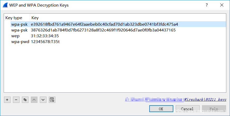 知道了这些,我们大概有这么个思路,分析dict.pcapng,找到能够解密huwang.cap握手包的秘钥,这个秘钥对于wireshark解密握手包而言,有三种格式,一种是针对wep的wep格式,另外两种是针对WPA的wpa-pwd和wpa-psk格式。详见下图