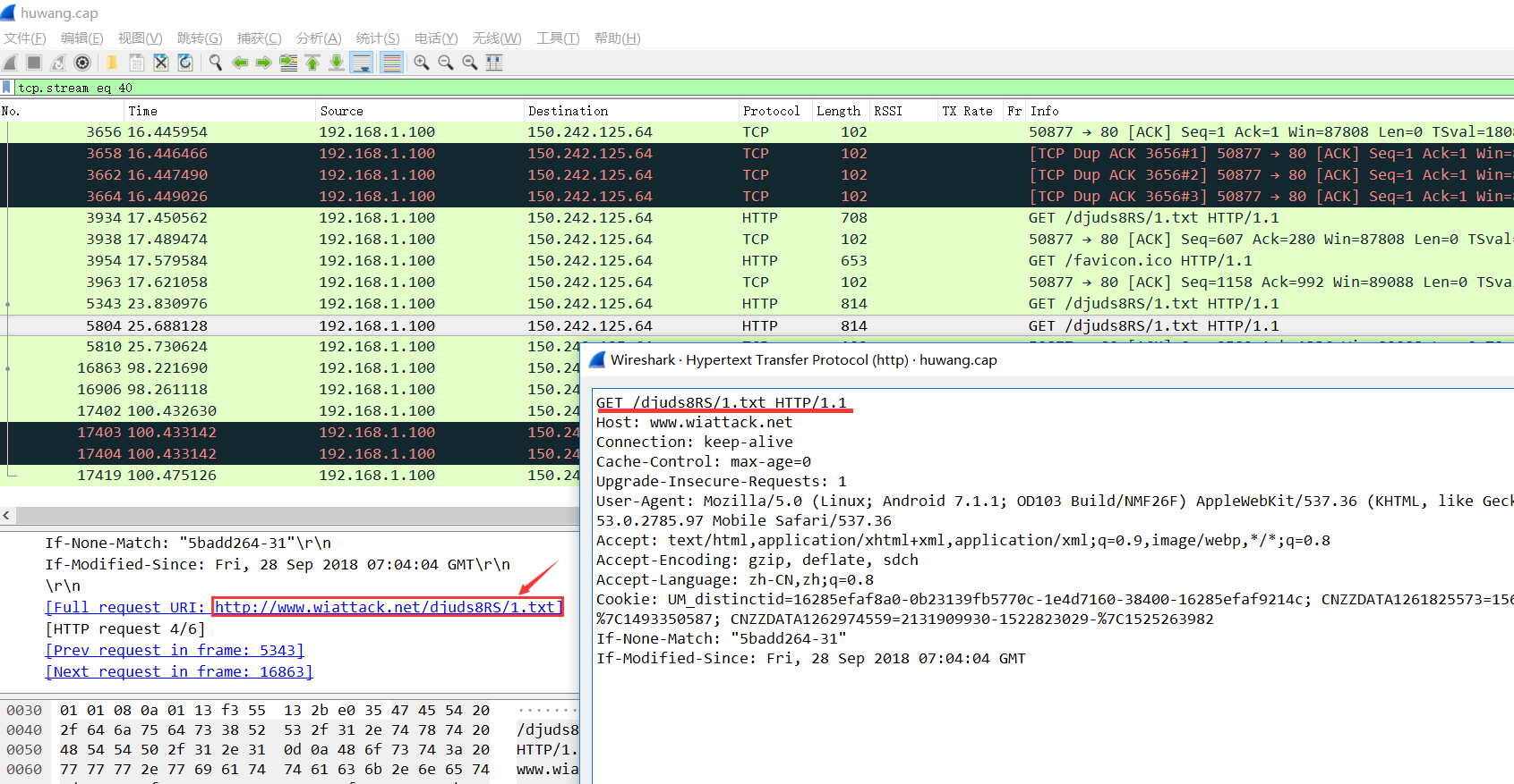 再次分析huwang.cap,发现上层数据均已显现出来。分析http,发现一个/djuds8RS/1.txt的访问路径