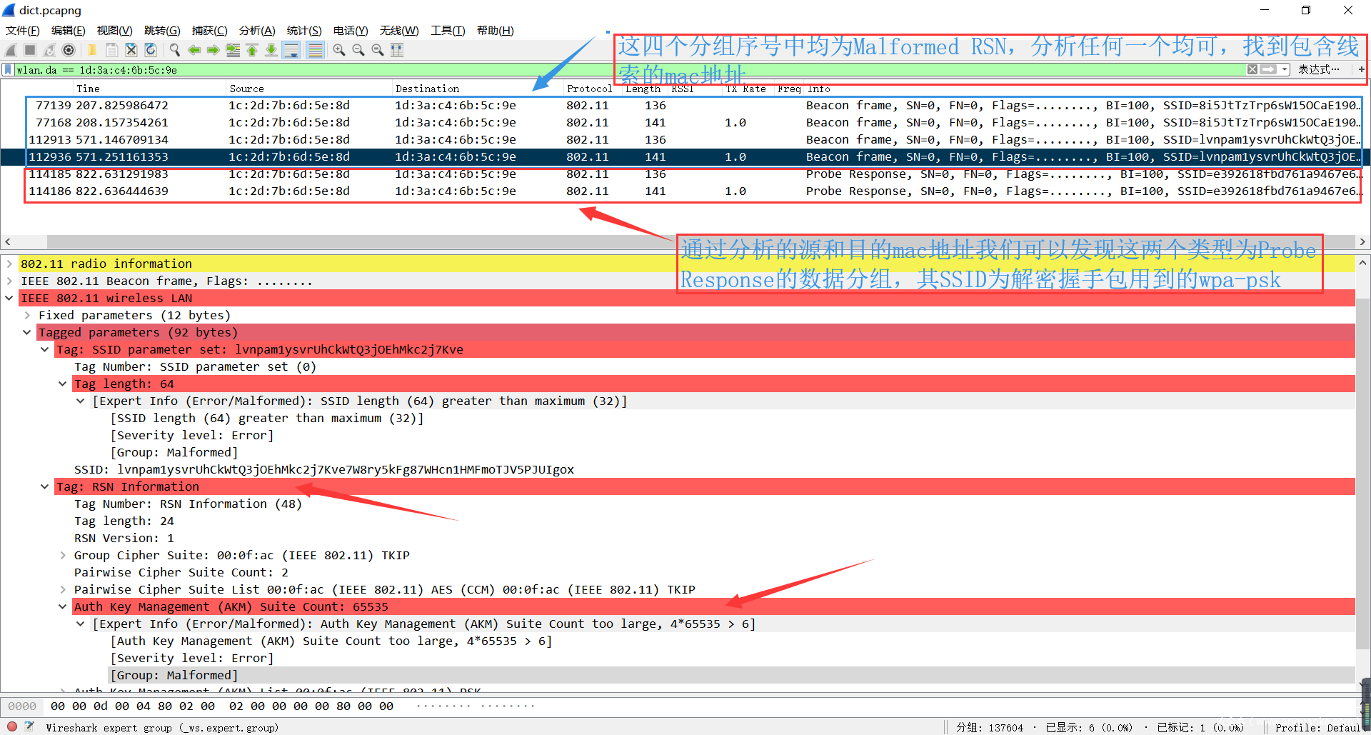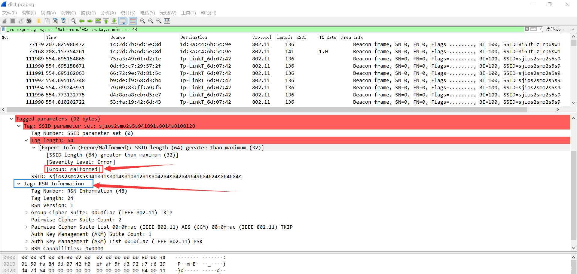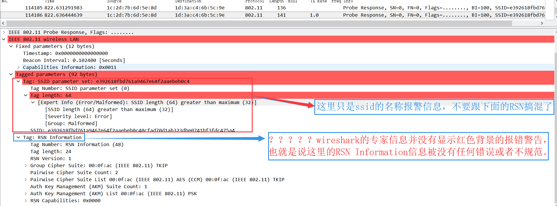 随后我认真的分析了下这两个数据分组,发现并不完全符合题目中两个提示的要求,这是两个不规范的802.11 frame,但是并不存在malformat RSN的数据呀。这里刚开始以为提示错了,因为按照下图所显示的,只是存在ssid的tag标签Group为Malformed,后面跟着的是正常的Tag:RSN Information的标签。(后来返回去思考,发现是自己错了,这个后面再详细解释)。额,下面这个图有个描述有错,“被”应该改为“并”。