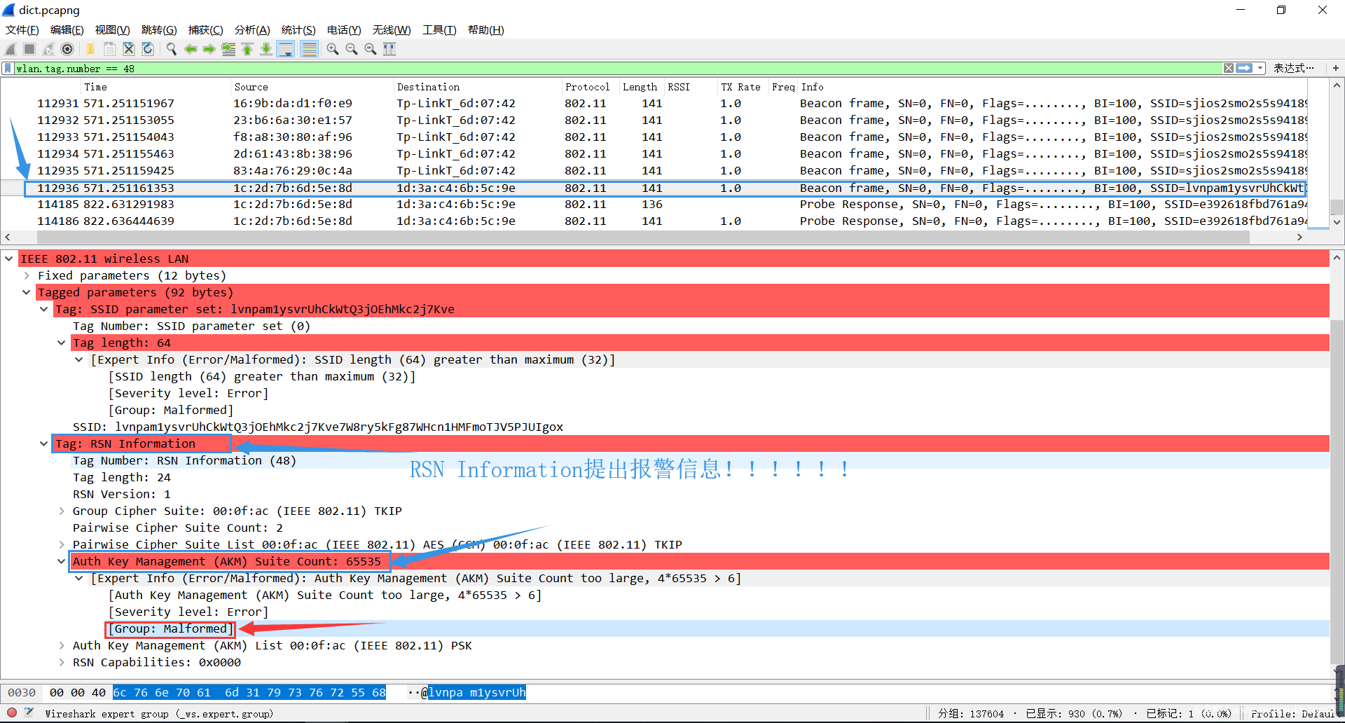 结合提示2和3的过滤语句最后构造为_ws.expert.group == “Malformed”&&wlan.tag.number == 48,下图为过滤结果,过滤出来全都是含有Tag:RSN Information和malformat的帧。