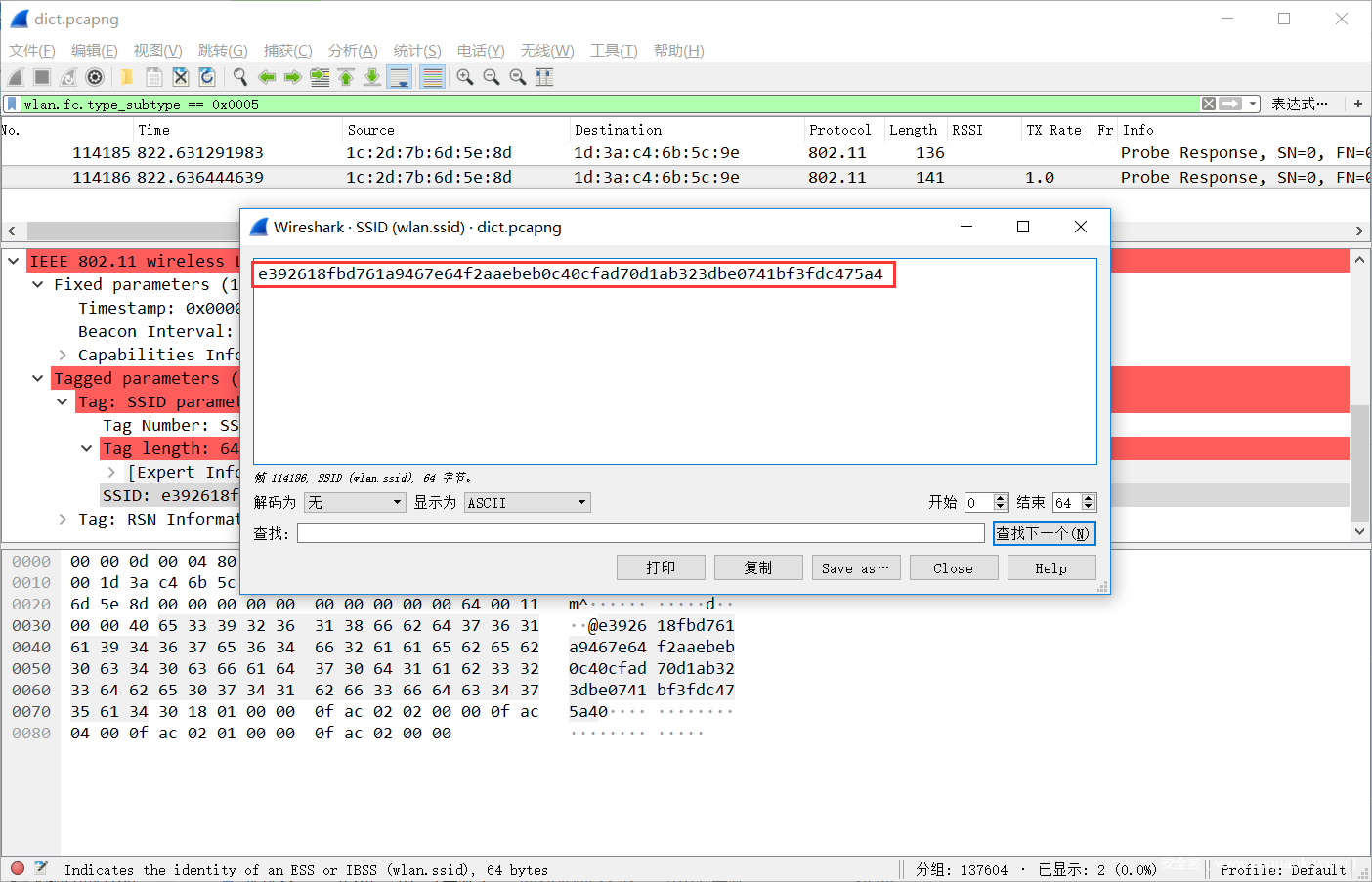 过滤之后,可以看到这两个畸形帧SSID的值均为e392618fbd761a9467e64f2aaebeb0c40cfad70d1ab323dbe0741bf3fdc475a4。(正好这个时候,出题老哥接受了我的好友申请,我就把自己到这步的思路跟老哥说,老哥有点惊讶”对,就是这个,你是怎么找到的?” “额,直接执行过滤语句wlan.fc.type_subtype == 0x0005找到的”)。