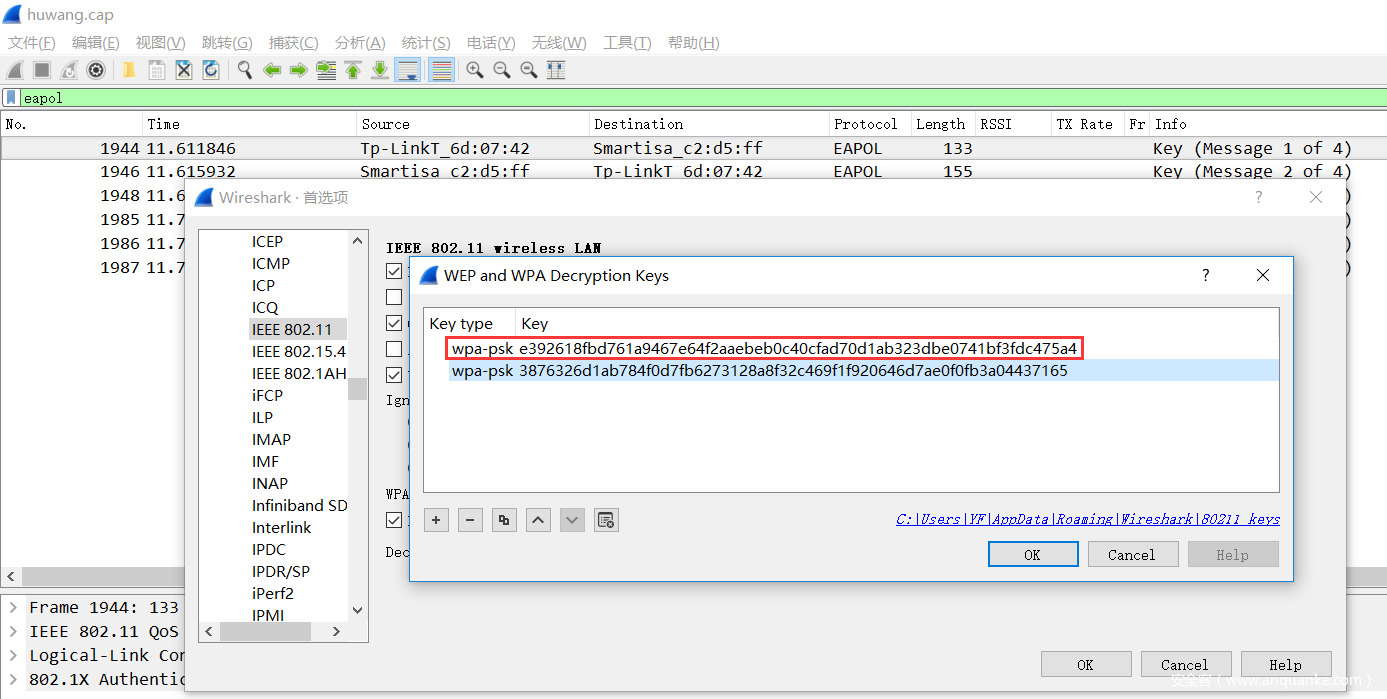 顺着刚刚的思路,打开wireshark,依次按照步骤操作:编辑 -> 首选项 -> Protocols -> IEEE 802.11 ,点击Edit,选填wpa-psk,输入刚刚得到的PSK值(那个64位的字符串),进行解密。(说来你可能不敢相信,那是一个慵懒的早上,我躺在床上情不自禁地想着那串64位长度的字符串到底是怎样能解开握手包时。突然意识到这个64字符串有可能是通过wpa-psk解密时所需要的key值,越想越可能,没想到还真是。这种感觉贼虚服,不知道老哥们有没有这种感觉,只可意会,不可言传。)