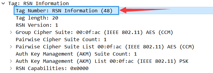 因为Tag:RSN Information中Tag Number为48,所以构造过滤语句wlan.tag.number == 48