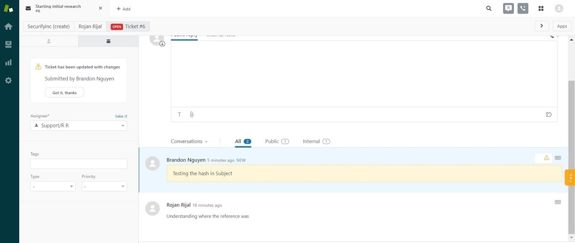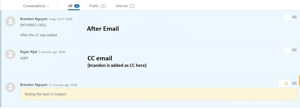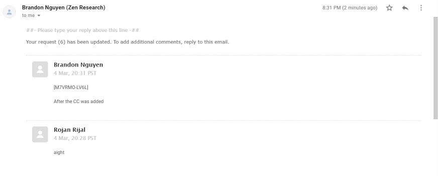 目前一切看上去正常,因此我让一起研究的小伙伴Brandon Nguyen往support@redacted.zendesk.com发一封邮件,主题设置为[M7VRMO-LV6L](使用前面获得的这个哈希)。我想测试一下如果另一个发送方使用了同一个哈希值,在Zendesk端会观察到什么情况。结果agent端的确出现了非常奇怪的情况: