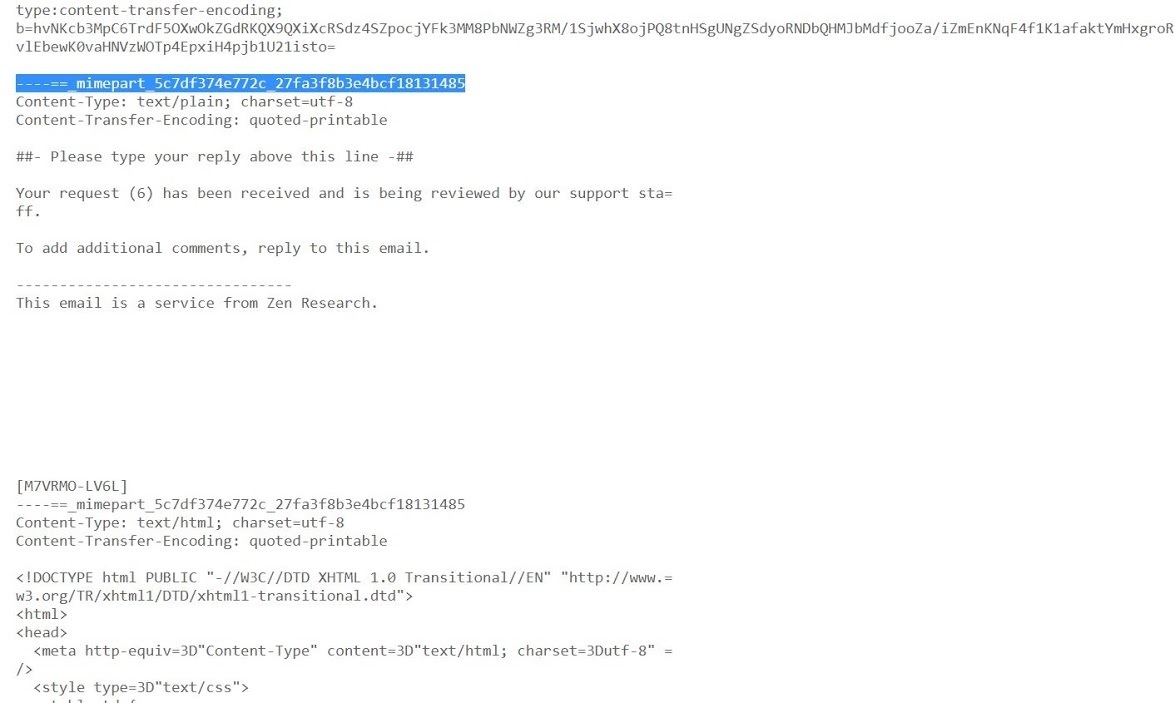 在上图中共有两处----==-mimepart,第一部分是纯文本,第二部分是HTML正文。这种设计方式使得只能接收纯文本邮件的邮件客户端也能接收这封邮件并能正确显示。目前一切看起来非常正常,然而在“This email is a service from Zendesk”这句话后,情况有所变化。接下来我们可以看到一个有趣的字符串,由数字和字母组成:[M7VRMO-LV6L]。这个字符串看上去非常有趣,所以我决定记住这个值,开始下一阶段测试。