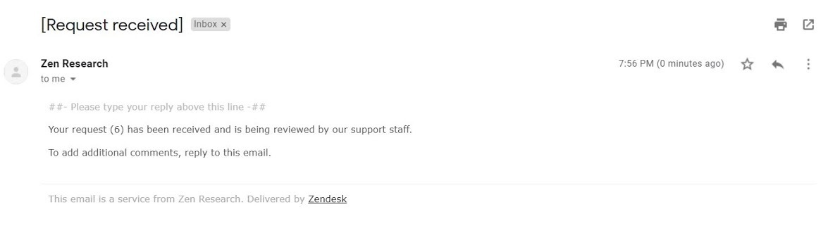 当支持系统收到我的邮件时,就会自动回复一封邮件,这也是ticket在Zendesk中常见的创建方式。Zendesk通过自动回复邮件表明已收到ticket。