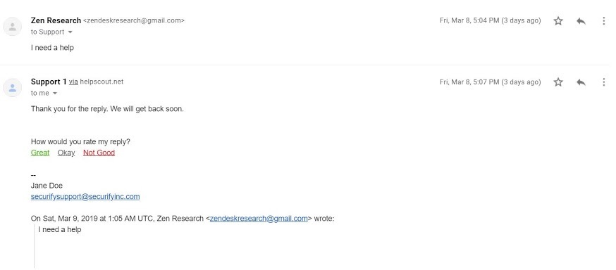 为了更好理解Help Scout的工作流程,我决定采用与Zendesk相同的分析步骤。这里有一点不同,Help Scout并没有太多官方文档介绍系统工作流程,因此我决定自己研究。与前面一样,首先我向测试环境发送了一封邮件,因为我在Help Scout上启用了自动回复功能,因此会收到一封自动回复邮件。